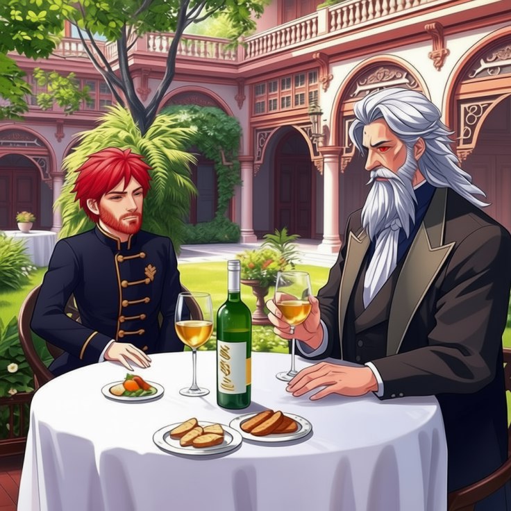 Сейчас же внутри двора (если не считать глухонемого слугу) находились двое мужчин: пожилой, но ещё крепкий хозяин богатой недвижимости и его гость. Оба попивали прохладное белое вино, разбавленное так, чтобы сохранить вкус, но хозяин и (в меньшей мере) гость могли избежать заметного опьянения, даже выпив значительное количество этого изысканного напитка.