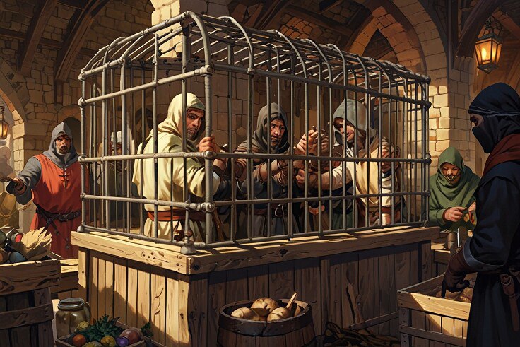Его взгляд упал на большую клетку, в которой томились человек двадцать. Среди них выделялся один — высокий, худощавый мужчина с седыми висками, свежим рубцом на щеке и без одного пальца, который он явно потерял недавно. Он не роптал и не просил, а молча сидел, прислонившись к прутьям, и его холодный, оценивающий взгляд изучал окружающих с безразличием обречённого волка. Рядом с ним жался щуплый рыжеволосый паренёк, постоянно что-то бормочущий под нос.