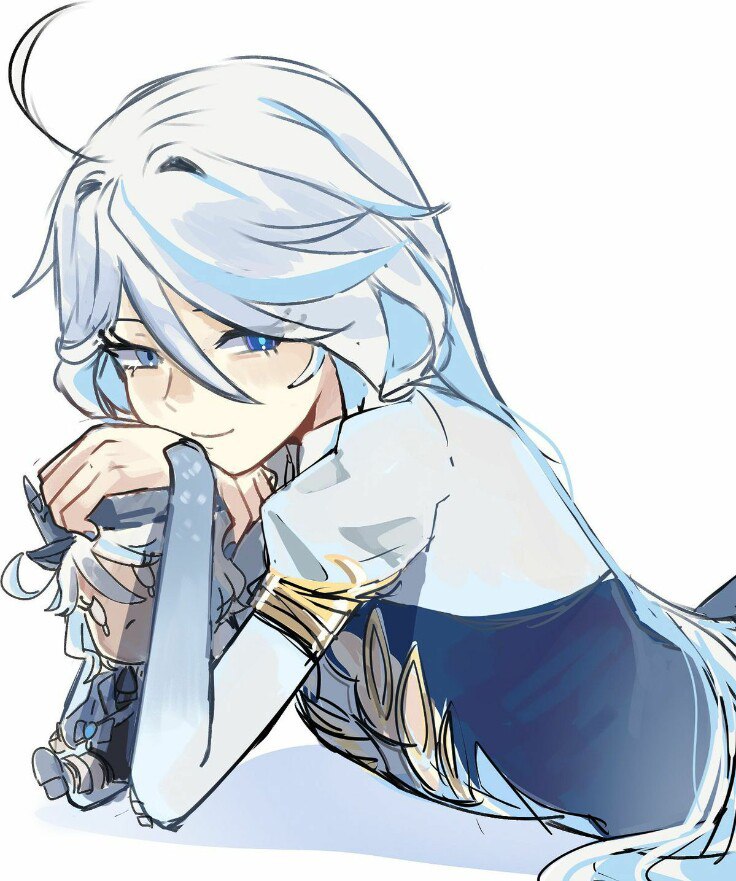 Я повернул голову и увидел Фурину, сидящую рядом на краю потрёпанного стола, с грацией, будто она не в руинах подземного зала, а на подиуме оперного театра. Это был точно мой «босс», хотя одета она была иначе: в официальном наряде богини, что подчёркивал её божественную сущность с изысканной элегантностью. Длинные белоснежные волосы, переливающиеся, как свежий снег под лунным светом, падали волнами по плечам и спине, обрамляя лицо с утончёнными чертами — высокие скулы, нежная кожа, словно выточенная из фарфора, и яркие синие глаза, искрящиеся любопытством и лукавством, с лёгким блеском, что напоминал глубины океана.