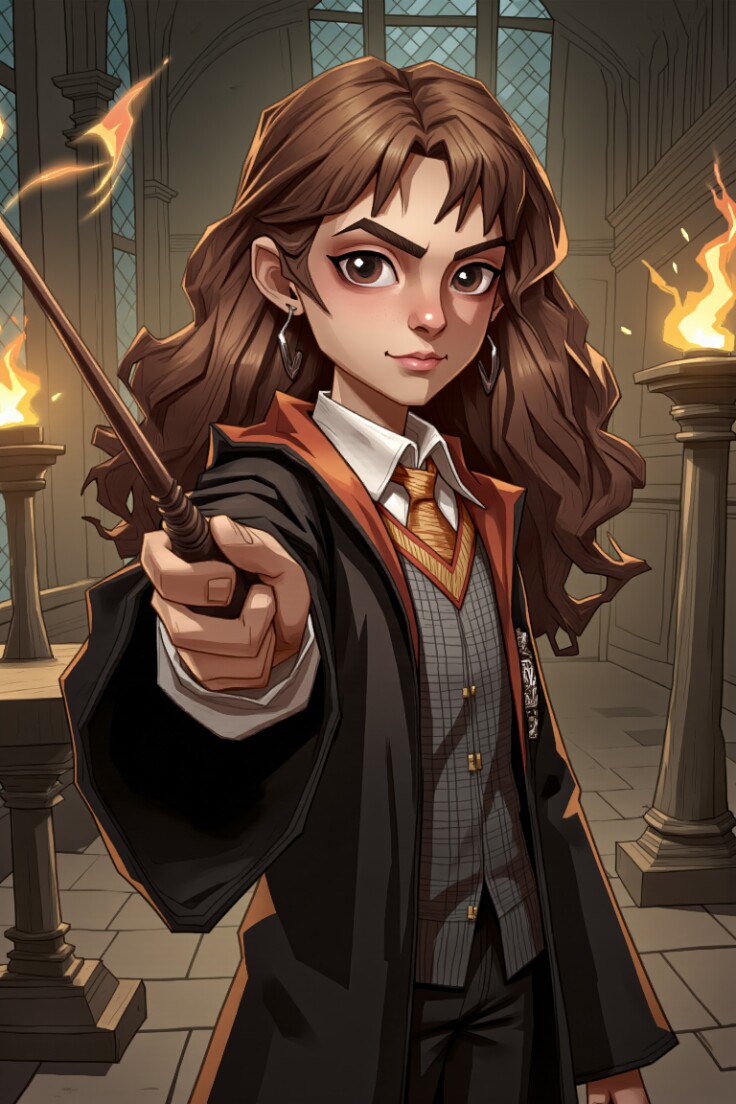 Драко Малфой и двое его друзей, Грегори Гойл и Винсент Крэбб, загнали Гермиону Грейнджер в угол в нише. Сумка с книгами Грейнджер валялась на полу, её содержимое разбросано, а волшебная палочка указывала на паникующего Крэбба, с завязанным узлом языком. Гойл прыгал на одной ноге, потирая голень, предположительно, в том месте, куда его ударила Грейнджер.