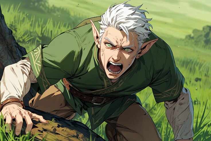 Одет незваный гость из портала был в нечто среднее между облачением эльфийского аристократа и крестьянина. То есть это был зелёный костюм, который не выглядел новым, но и сильно потрёпанным его сложно назвать. Оттого было сложно определить, кто он такой: батрак, маг, рейнджер? Меч на поясе отсутствовал, как и магический жезл, зато имелся длинный кинжал и лук за плечами. Ну и, конечно же, заострённые уши.