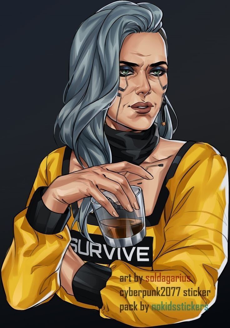 На глаз, что очевидно, столько ей было не дать. Внешность и возраст в Найт-Сити вопрос исключительно денег и желания. Фиксерша не молодилась до образа двадцатилетней, но и сильно за сорок не выглядела. Такая себе малость переспевшая милфа, с распущенными длинными волосами серого цвета, в дорогой, но крайне практичной одежде — чёрных обтягивающих штанах и жёлтой кофте с надписью: «Выжить». Ну и завершающий штрих — с бокалом неизвестного, но явно дорого напитка в руках.