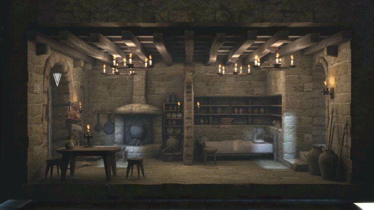 Посередине комнаты возвышалась массивная каменная колонна, поддерживающая потолок, а вокруг неё раскинулся пол из потёртых плит, на которых лежали разноцветные коврики, сотканные вручную. Справа от входа стоял грубо сколоченный стол из тёмного дерева, окружённый тремя стульями с плетёными сиденьями. На столе уже ждали тарелки, наполненные свежими фруктами — яблоками, грушами и ягодами, — а рядом лежала простая выпечка, ещё тёплая, с золотистой корочкой, и графин с прозрачной водой, в котором отражались блики света. Слева у стены притулился уже потухший очаг, выложенный из кирпича, с чёрным котелком, от которого исходил лёгкий аромат — похоже, это был рыбный суп, с нотками трав и слабым рыбным привкусом, оставшимся в воздухе.