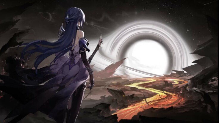 Мир вокруг раскрылся в мрачном безмолвии, как пасть чудовища. Ни дуновения ветра, ни шороха, ни намёка на жизнь — только редкие всполохи лавы, извивающиеся между чёрными скалами, словно змеи из жидкого золота. Они мерцали тускло, отражая ослепительный свет огромной белой дыры, что висела прямо в небе, доминируя над всем.