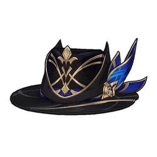 И тут мне попалась на глаза шляпа, от вида которой по спине пробежались мурашки — холодные, как ледяной ветер, — и усилилась боль в голове, пульсируя сильнее, как будто разум пытался прорвать барьер. Чёрная, с золотыми узорами в виде переплетающихся линий с синими перьями, торчащими сбоку, она лежала на полке, слегка покрытая пылью, но целая, элегантная и загадочная. Это важная шляпа — не просто аксессуар, а символ, ключ к чему-то глубокому, вызывающий эхо эмоций: гордость, приключения, потерю.