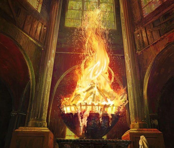 Не помню, как оно выглядело в каноне, однако в реальности это была огромная литая цельнометаллическая чаша, на бортах которой была выгравирована история войны между асами и огненными великанами, а внутри неё самой, без какого-либо топлива, горело неукротимое жёлтое пламя, искры которого рассыпались по округе. Не обжигая, наоборот — давая чувство какого-то внутреннего, неуловимо родного тепла.