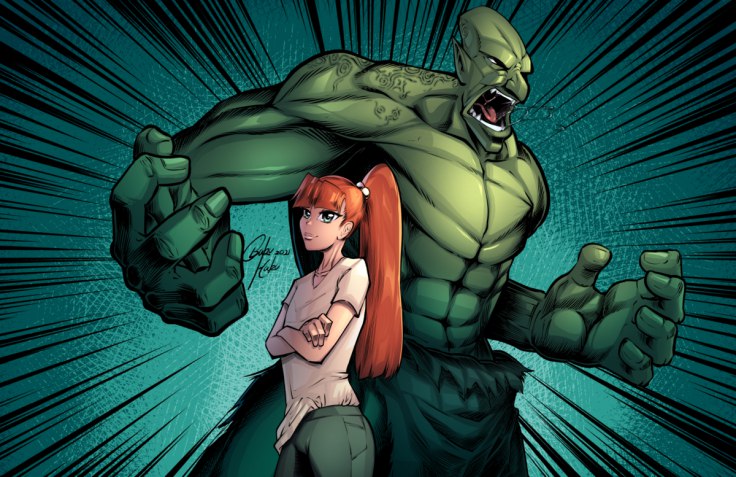 Всего мгновение и её клыки вырастают до жутких размеров, а сама она увеличивается в размерах и превращается в жуткого зелёного верзилу…