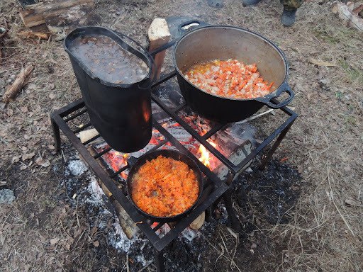 Получив разрешение на отдых и уточнив время у ближайших охранниц (а кое–кто и вовсе наехал на «богачку»), бойцы разбили лагерь и дружно скинулись на обед, у кого что было припрятано. Поставили десяток треног, по мимо полевой кухни, развели огонь, и стали готовить гречку с мясом и ещё что–то напоминающее густой суп. Рецепт был предельно простой, бралась сковорода (которые умудрились раздобыть у местных), на которой обжаривались лук, мясо, а потом кидалось в котел, куда ранее кинули какую–то крупу, а после содержимое сковородок кидали в котел, всё это варилось минут десять пятнадцать и подавалось бойцам.