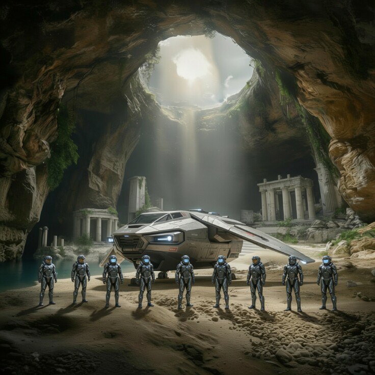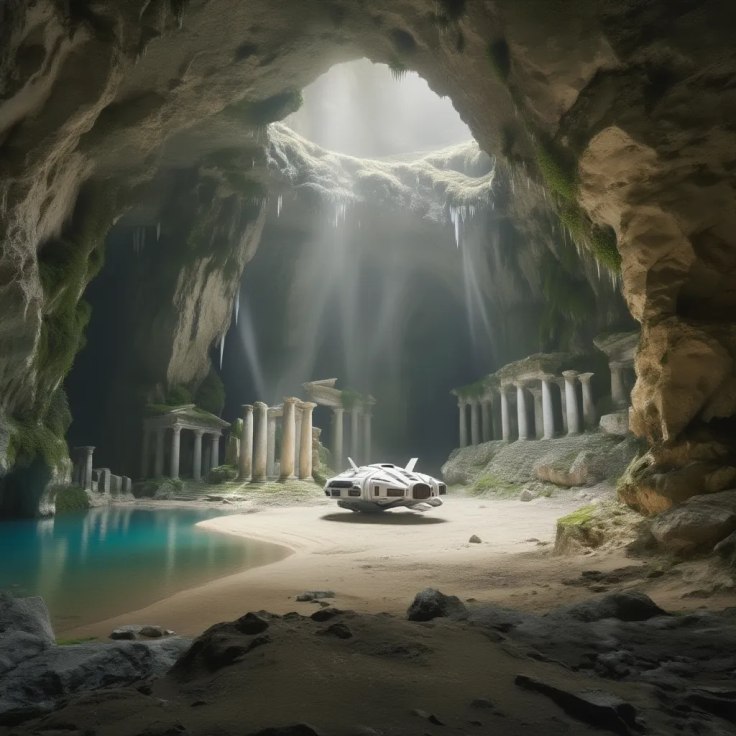 Неровные тёмно-серые стены воронки промелькнули быстро и челнок оказался в огромном скальном гроте. Прожектора освещали огромную пещеру, песок и мелкую гальку внизу, кое-где виднелась, как зелёная, так и изрядно порыжевшая зелень. В этом полушарии Мистерии уже наступила зима, пусть и конкретно здесь снежного покрова не наблюдалось. Зато миль на двести севернее он уже вовсю лежал. Однако куда интереснее выглядели для спустившихся с небес людей древние даже на вид руины, расположившиеся у самой воды. Выложенная белыми плитами дорога с лестницей, спускавшейся к самой водной глади, столь же белые высокие арки и колонны… И, конечно же, она. С замиранием сердца, Чарльз судорожно сглотнул, когда луч света выхватил из тьмы простёршуюся от края до края подземелья идеально-ровную серебристую стену.