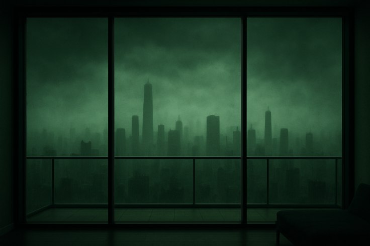 Город снаружи был не просто большим — он был бесконечным. Тысячи небоскрёбов выстроились рядами, уходя за горизонт, переплетённые паутиной магистралей-эстакад. Но всё это утопало в тумане. Не в обычном сером мареве, а в чём-то густом, жирном, с зеленоватым отливом, будто кто-то вылил в атмосферу тонны светящейся краски. Туман поднимался на сотни метров, облизывая здания примерно до середины, и только самые высокие здания торчали над ним, как одинокие и мёртвые. Небо над туманом было затянуто сплошной пеленой туч цвета мокрого бетона, без единого проблеска. И тишина. Полная, давящая тишина, которую изредка разрывал низкий, протяжный гул, будто сама планета стонала от боли. Даже через тройные стеклопакеты он пробирал до костей.