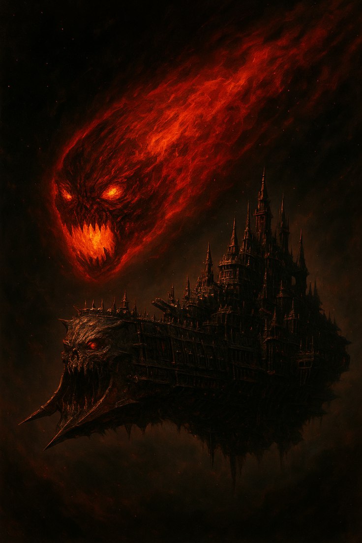 Перед флотом же неслась исполинская кроваво-алая комета, окутанная тёмным пламенем. Широкая клыкастая пасть ощерилась с неудержимого огненного шара, из глубин которого взирали глаза, полные безумной ярости. Так на чёрнокаменную крепость явился сам Скарбранд. С чудовищной он врезался в обшивку станции, пока тем временем кхорнитские корабли, рассредоточившиеся вокруг огромной цели, обрушили на неё залпы орудий и выпустили густые рои десантных судов.