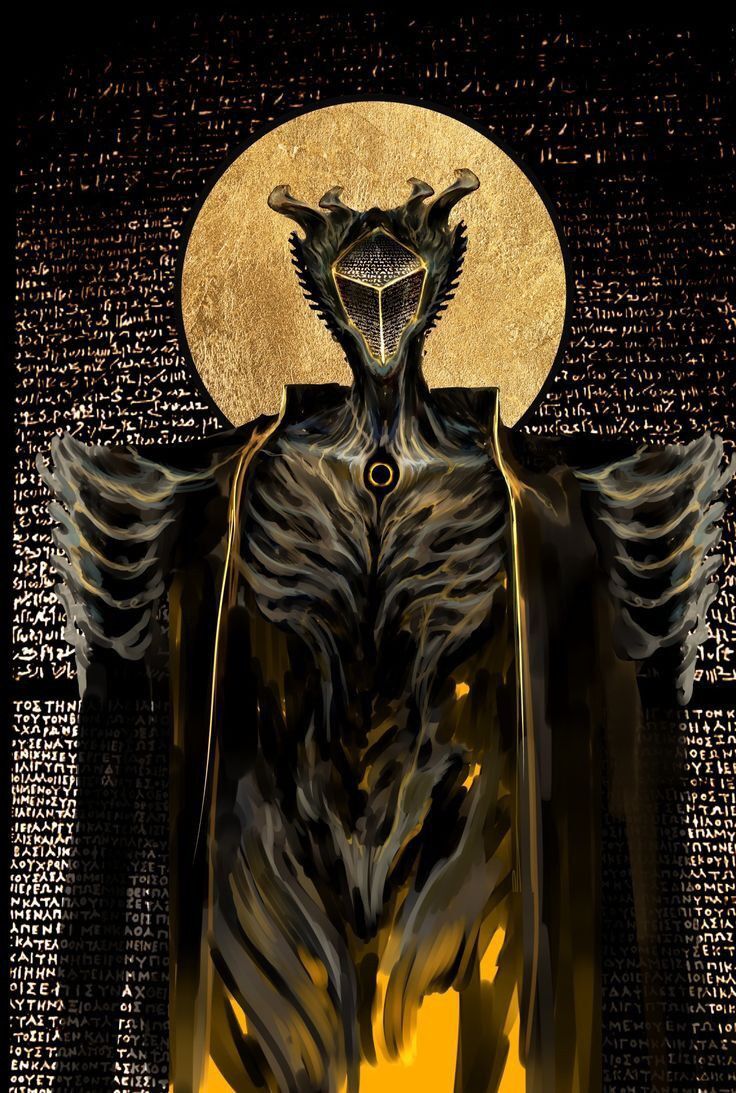 Наконец пыль и дым рассеялись. Вдали показалось нечто, отдалённо напоминающее человека. Оно обладало каким-то подобием тела. Не то кости, не то что-то иное, не то дымка создавали для него форму тела, покуда поверх неё словно бы ложился тёмный плащ. Вместо головы красовался какой-то неправильный чёрный куб с золотыми гранями и письменами на себе.