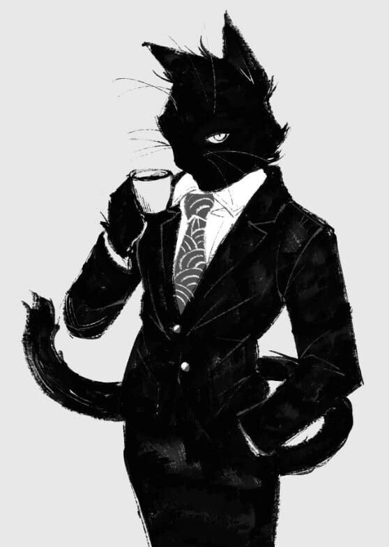Большой. Антропоморфный. Чёрный кот. Идеально ухоженная, лоснящаяся шерсть. На нём был безупречно сидящий черный костюм, ослепительно белая рубашка и галстук. В одной лапе-руке он небрежно держал блестящую фарфоровую кружку, другой вытирал барную стойку тряпкой. Его глаза, огромные, фосфоресцирующие серые диски, медленно обвели группу. На морде не читалось ни страха, ни удивления — лишь вежливое, слегка отстранённое любопытство.