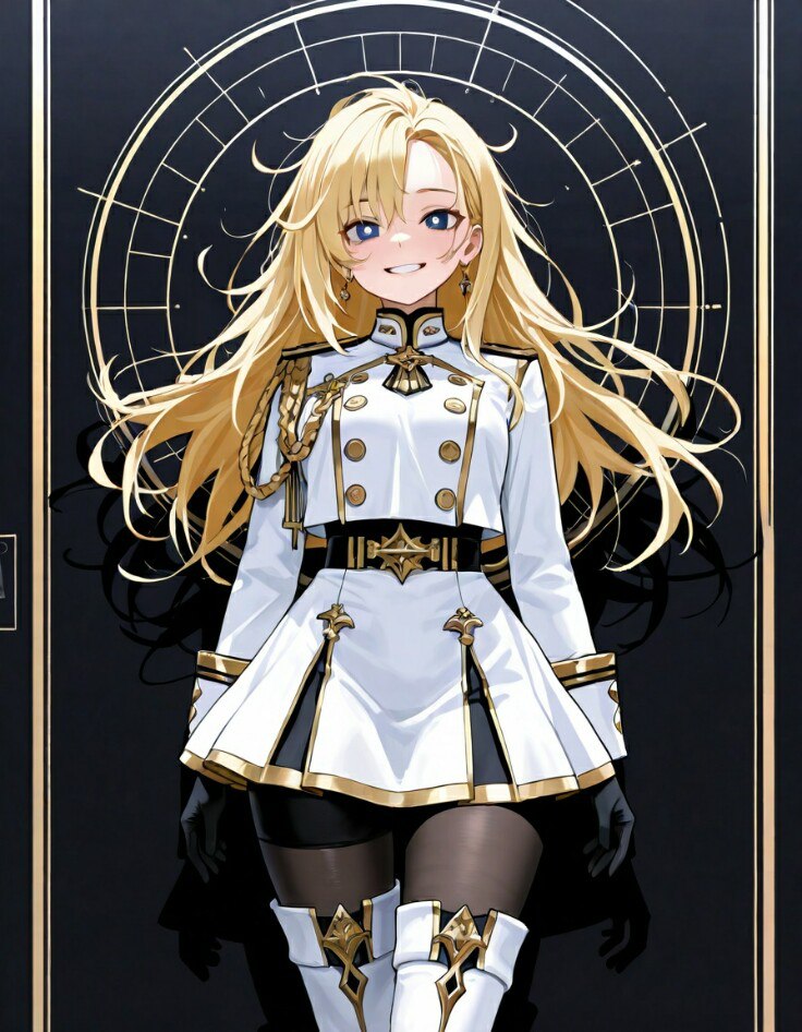 Хотел Флюкс только найти взглядом нужную для себя особу, как внезапно перед ним она и появилась. Прекрасная блондинка с чистыми светлыми длинными и распущенными волосами. В белой укороченной жилетке с золотым аксельбантом, изящными чёрными перчатками и короткой юбкой, оголяющей часть её бёдер в чёрных колготках.