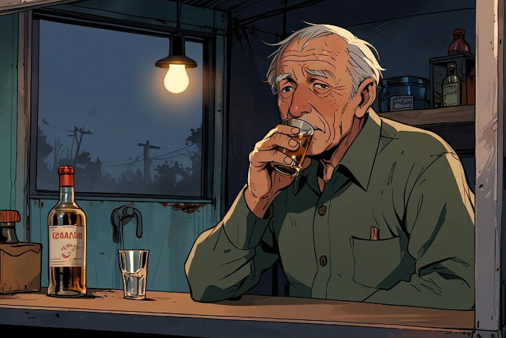 Сторож Василий вздрогнул в своей кибитке, после чего протянул дрожащую руку к бутылке водки на столе. Накапав в стакан на донышко, он с прищуром посмотрел на посудину. Потом налил ещё на половину стакана. Немного подумал, после чего наполнил граненный по краешек. Громко выдохнув, он залпом опустошил стакан, поморщился и закусил бутербродом с копчёной колбасой.