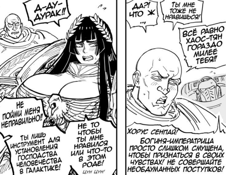 — Краткий доклад ветерана-сержанта Джастиса Гхунфрида: Капитан-командующий, докладываю. Силы мятежников, якобы сражающихся за Империум выкрикивают в наивысшей степени странные боевые лозунги. В них они упоминают тот факт, что им якобы обещаны фелинидки-жены, робогорничные и… Что они идут в бой за Большую И. Прошу прояснить ситуацию и наши дальнейшие действия, капитан-командующий. Гхунфрид доклад окончил. — буквально протараторил связист, выжидающе уставившись снизу вверх на стоящего Астартес, чьё лицо нахмурилось в непонимании.