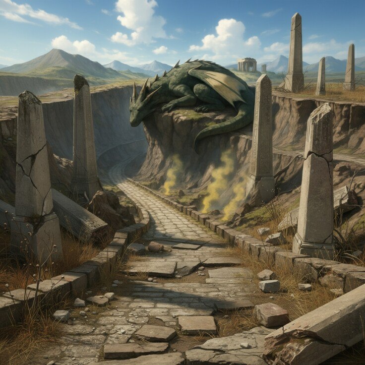 Похоже, это была та самая драконица, которую сумасшедшие культисты почитали за воскресшую Андрасте. За чудищем наблюдали больше часа, но зверюга за всё это время даже не пошевелилась. Надежд, что она улетит куда-то становилось всё меньше. Гектор уверенно опознал в ней высшую драконицу, которой уже не одно столетие. Крылатый монстр мирно спал и плевать хотел на суетящихся внизу людей. Горы там каменным цирком возвышались вокруг, образуя настоящий кратер. Когда-то очень давно через него пролегала дорога, мощёная крупными плитами, с откосами и заграждениями. Ныне же от неё осталось чертовски мало: сохранилось с десяток метров у выхода из драконьих пещер, а большинство высоченных обелисков, некогда возвышавшихся вдоль всего пути, были сломаны. Чем дальше, тем больше дорога превращалась в узкую тропинку с редкими вкраплениями древнего полотна.