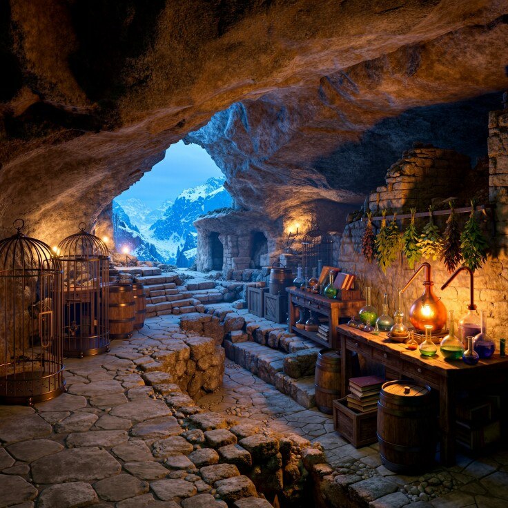 На другом конце зала начинался ещё один длинный проход, в конце которого брезжил белый дневной свет — выход наружу, не иначе. Это помещение оказалось заставлено куда плотнее предыдущих: массивные деревянные столы и даже каменные плиты на ножках, испещрённые непонятными символами, странные железные конструкции с прорезями, под которыми горел огонь, а в дальнем углу расположилось даже нечто похожее на алхимическую лабораторию.