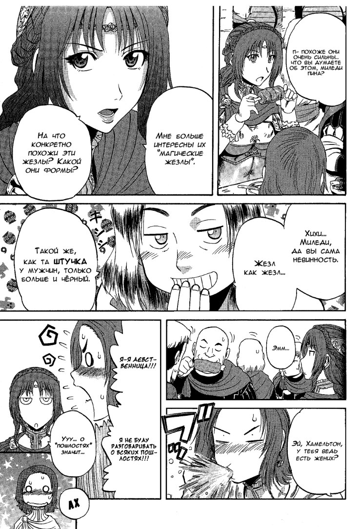 — Хихихи… Миледи, да вы сама невинность. — пошленько захихикала девушка. — Жезл, как жезл… Такой же, как та штучка у мужчин, только больше и черно–коричневый. — после этой фразы все мужчины тут же синхронно вдруг оказались заняты ужином, кто–то свистел или рассматривал вдруг ставший ему интересным потолок таверны. Посмотрев на этот театр глухоты, принцесса повернулась к единственной кроме нее девушке–соратнице.
