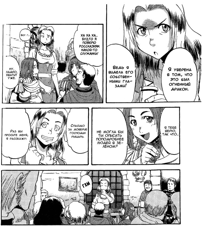 — Да. — подскочила девушка. — Банда наемников в зеленых одежда помогла эвакуировать жителей деревни Кода, а после победила огненного дракона.