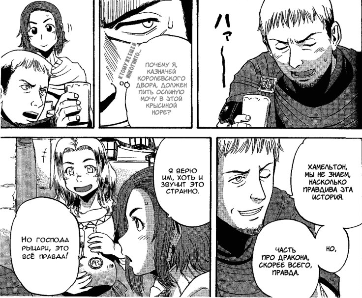 — Если бы не эти парни, то дракон сожрал нас всех! — заметил усатый мужчина, попивающий пиво из кружки. — Они защитили от дракона три четверти жителей деревни Кода!