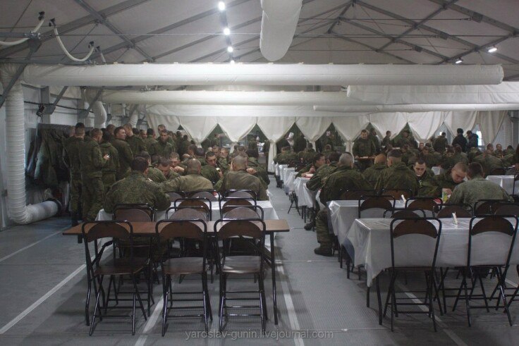 В этот момент вернулся их сопровождающий вместе с ещё несколькими людьми. Все они толкали металлические тележки с стоящими на них синими дощечками на которых располагалась посуда с пищей. Расставив дощечки перед каждым из спасённых, солдаты удалились, оставив сопровождающего одного.