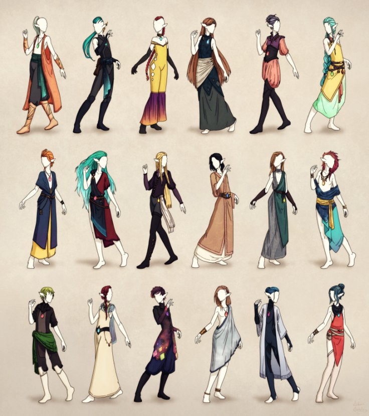 В этой вселенной люди и эльфы поменялись местами, и теперь у последних более практичная, удобная и лёгкая на вид одежда.