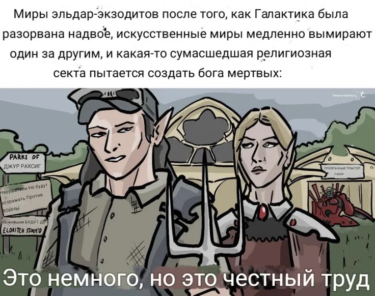 Удивительный пример возможности сосуществования, столь необходимый для примера, что людям и эльдар вот необязательно непременно убивать друг друга. Без Великой Шутки мы и так сами вымрем, так что… Ха-а-а… И кто-то после этого заявляет, что работа дипломатов легче, чем военное дело? Ха-ха-ха…