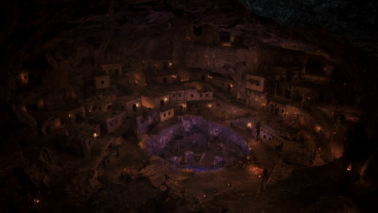 Сама она напоминает больше круглый карьер, чем обычную шахту — несколько застроенных уровней расположились по воронке, по которой туда-сюда сновали рудокопы, редкие воры и ещё более редкие наёмники. Мы проходим чуть дальше, обходя деревянные заграждения, и на подходе нас встречает хмурый наёмник.