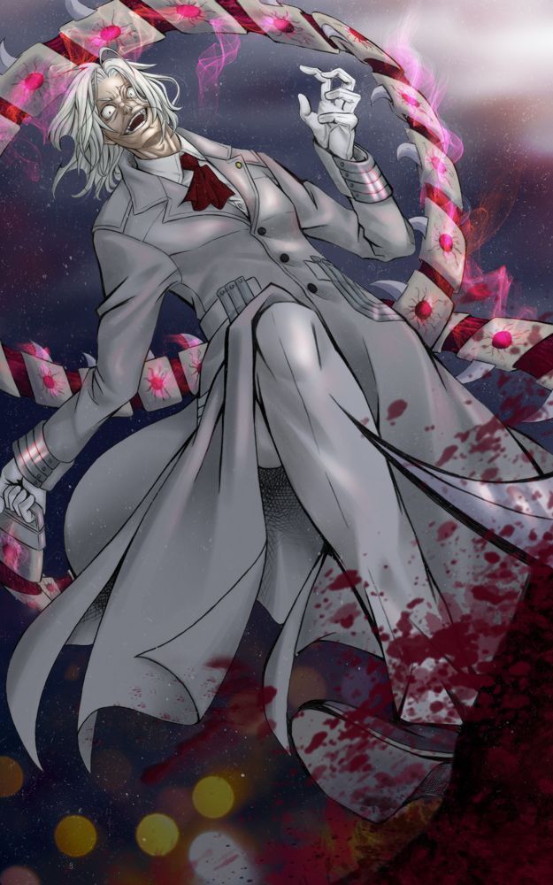 — Ха-ха, видеть, как такие как вы отчаянно сражаетесь, защищая кого-то, подражая людям, отвратительно. — крикнул седой мужчина, ударом своего Куинке, который представлял из себя нескольких плотно переплетённых щупалец, способных разъединяться.