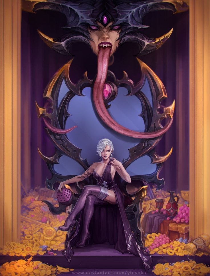 Вместо золота вокруг трона образовались демоны, а вместо трона и прекрасной девы на нём — высокое четырёхрукое существо с андрогинным телом и головой какого-то быка, да руками-клешнями.