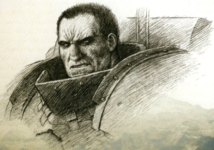 Голова примарха Железных Рук резко поворачивается в нашу сторону, являя мрачное и даже по меркам иных сыновей Императора — суровое лицо. Лицо, бывшее на голове с коротким чёрным ёршиком волос.