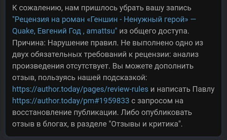 А можно было просто внимательно прочитать первое уведомление, изучить правила составление рецензий, связаться с администрацией и, наконец, дополнить статью, что я и сделал, потратив на все вместе не более часа — и дописав половину на ходу, пока шел домой с ЖД станции. В результате рецензия стала почти в два раза больше и, надеюсь, в сравнимой степени с̶м̶е̶ш̶н̶е̶е̶ серьезнее.
