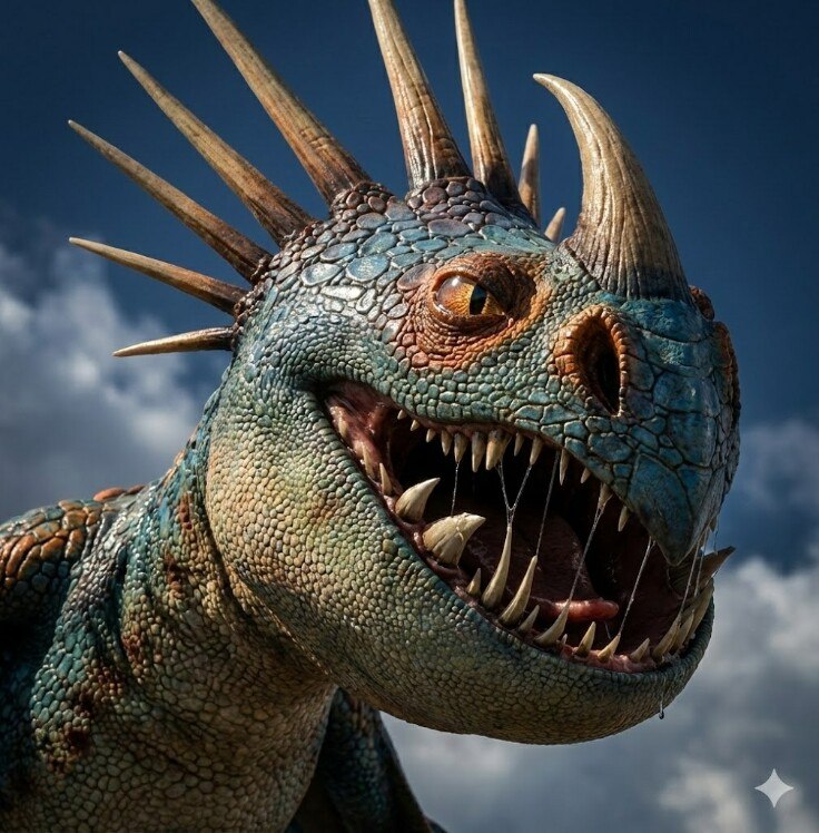 Помимо имени вопросом серьезным был и подход в знакомстве — здесь работала тактика «кто кого перехитрит». Скади, несмотря на свою грозную внешность (шипы, магниевое пламя, клюв, способный дробить камни), оказалась существом… суетливым. Она постоянно была в движении. Чистила крылья, полировала чешую, расправляла свой веер из шипов, красуясь. Но при этом — до жути пугливая. Стоило мне однажды уронить ведро с водой на камни — БАХ! — как Скади, даже не оборачиваясь, рефлекторно метнула шип с хвоста.