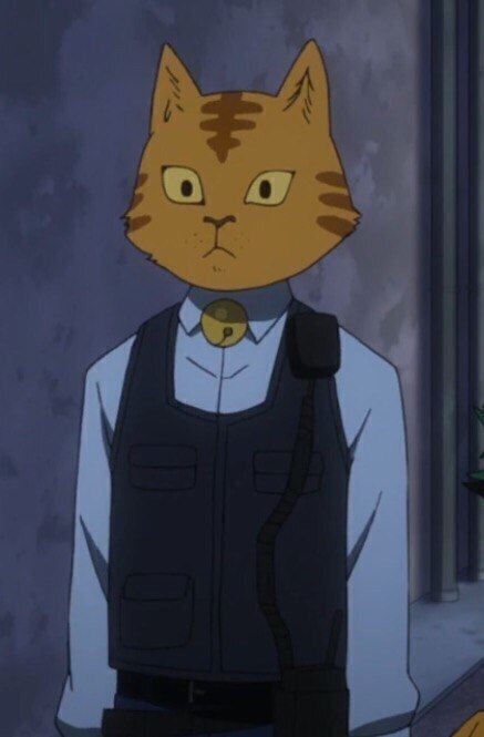 Рядом с ним по обе руки: слева стоял офицер-кот в полицейской форме, а справа обычный черноволосый японец в костюме и поверх в бежевом плаще. Возможно, это был детектив.