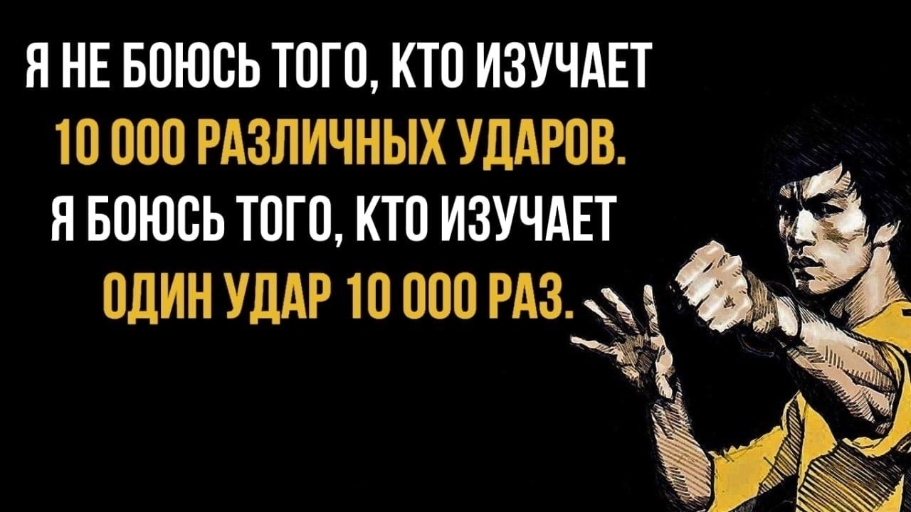 — Это конечно не мое дело… но я не боюсь того, кто изучает 10 000 различных ударов. Я боюсь того, кто изучает один удар 10 000 раз. Понимаешь, к чему я веду?