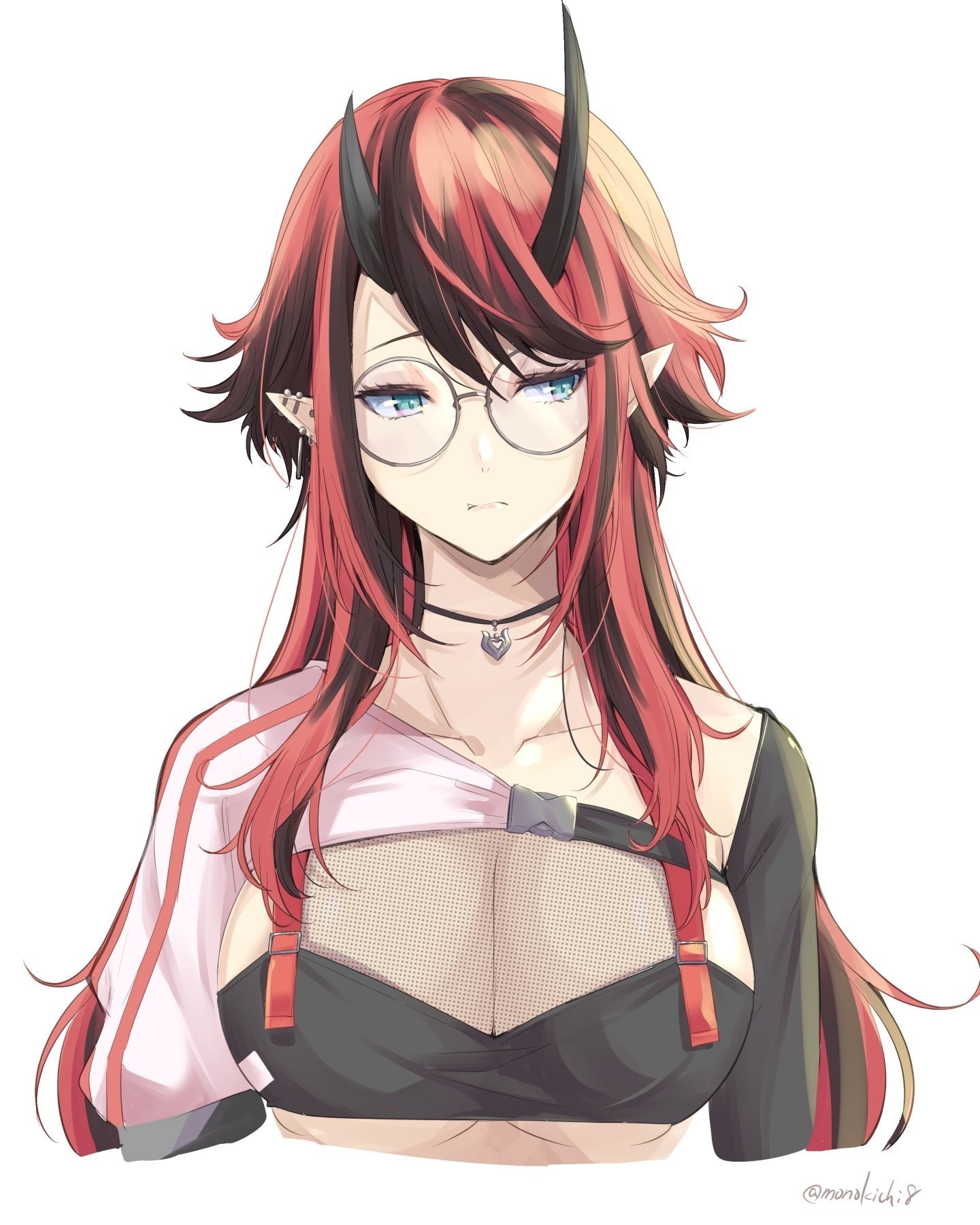 Эта была молодая девушка, быть может чуть старше двадцати. На ее скучающем лице, находились больше очки велосипеды, за которыми скрывались яркие, голубые глаза, которые смотрели на мир без всякого интереса к происходящему. Однако особенно в ней выделялись её кроваво-красные волосы с длинными, черными прядями и все это, тщетно пыталось спрятать длинные матово-черные рога, присущие скорее демонам из религий нежели обладателю причуд. Даже на шее незнакомки, находился чокер с медальоном в виде рогатого сердца и вместе с этим, на ней был одет лишь небольшой топ, который прикрывал лишь её грудь небольшим количеством ткани и чисто декоративной сеткой, в то время как все остальное тело было открыто широкой публике вплоть до короткой юбки. Хотя по мнению самого Мидории, то, что действительно выделялось в облике неизвестной, так это розовый, воздушный рукав закрепленный на другом плече. Словно бы он был действительно особенным.