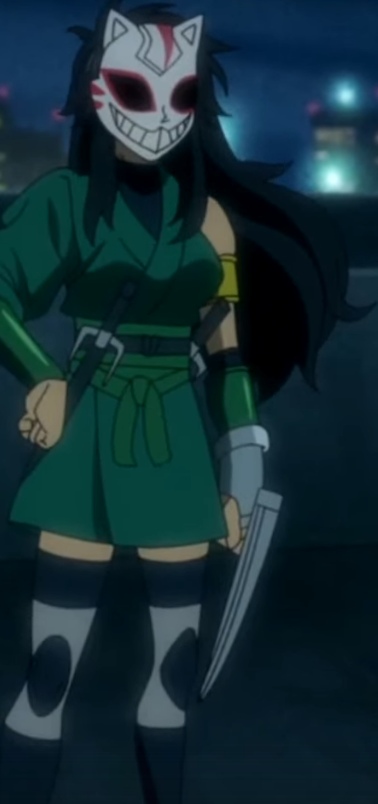 Воровка обернулась и увидела перед собой женщину в укороченном зеленом кимоно и белой фарфоровой кошачьей маске, стилизованной на японский манер, из-под которой выбивалась густая шевелюра темно-синих волос. На поясе у неё висела пара саев в ножнах, а на правой руке разместилась необычного вида перчатка с четырьмя длинными когтями, прикрепленным к костяшкам. Поклонники японской культуры или же мультсериала про канализационных рептилий без проблем могли понять, что это текко-каги — боевые когти ниндзя.