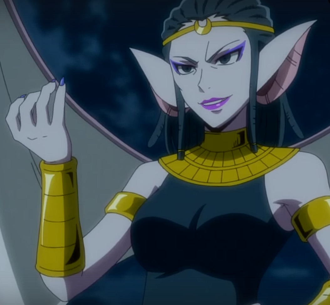 Стоило словам отзвучать, как сверху раздался приближающийся свист, а затем на крышу приземлился здоровенный вытянутый объект, оказавшийся живым существом, завернутым в кокон из белых кожистых крыльев, похожих на крылья нереально здоровой летучей мыши. Собственно, сравнение с летучей мышью оказалось верным, ведь стоило крыльям распахнуться, как перед удивленными зрителями предстала высокая бледная женщина, чей внешний вид соответствовал древним легендам об истинных вампирах (за исключением приятного личика с привлекательным фиолетовым макияжем). В наличии также были здоровенные уши-локаторы, а клыкастая улыбка могла вызвать священный трепет у любого стоматолога. Одета знакомая Чешир была в закрытый синий купальник с золотыми элементами, вызывающими ассоциации с египетскими мотивами, чему способствовали золотые браслеты с таинственными символами на предплечьях, а также небольшой золотой обруч с полумесяцем, удерживающий длинные темные волосы, заплетенные во множество тонких косичек.