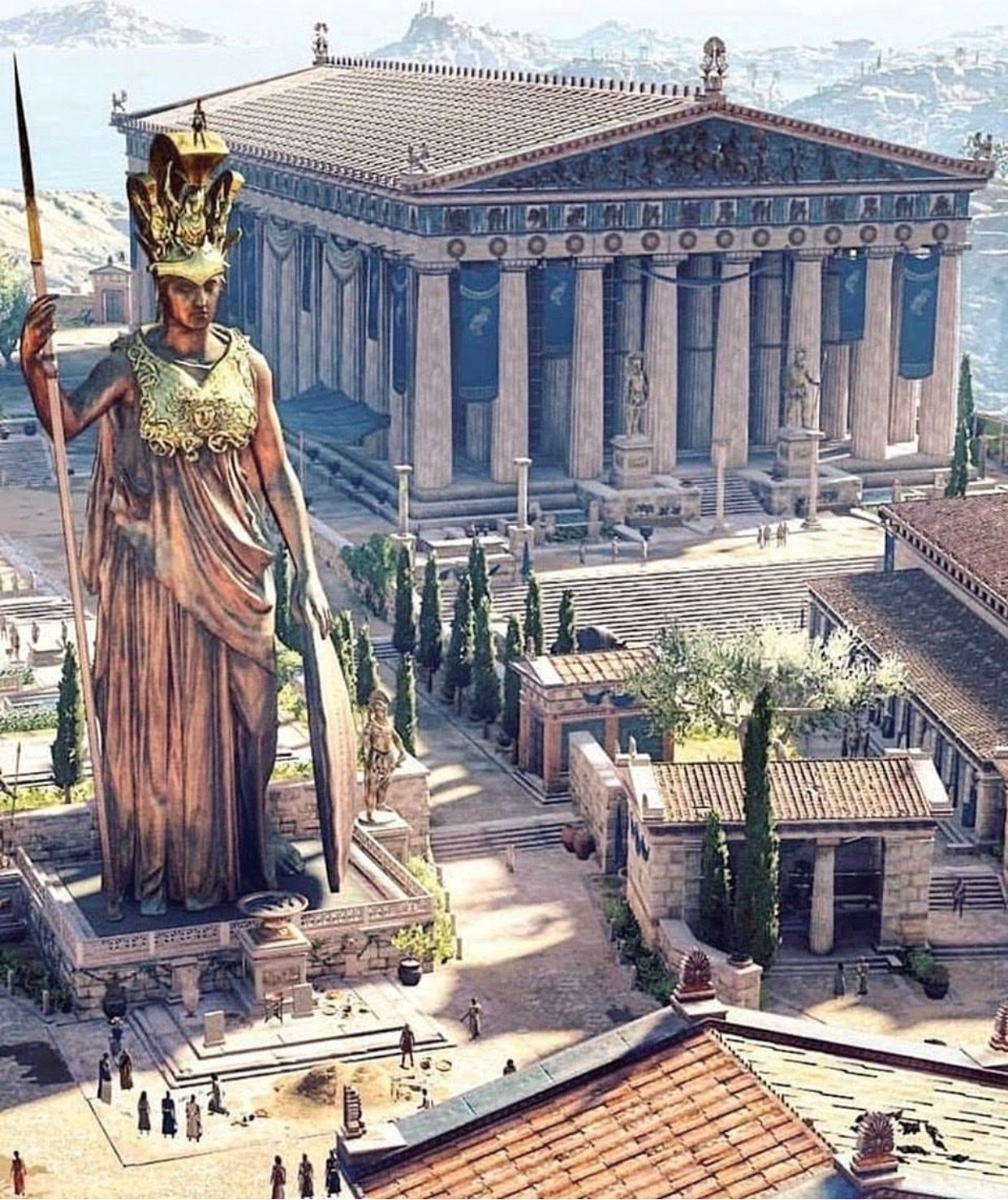 Величественные циклопические постройки с белоснежными колоннами и красивыми барельефами соседствовали с более скромными двухэтажными жилыми домами с красной черепичной крышей. Между зданиями пролегали широкие дороги, мощенные каменными плитами, в северной части города виднелись здоровенные акведуки. На просторных площадях обязательно присутствовали гигантские бронзовые статуи, изображающие богинь. И когда я говорю «гигантские», то подразумеваю минимум двадцать метров в высоту. Хм, а ведь по легендам боги умели вселяться в свои изображения, так что подобные арт-объекты вполне могут служить одной из линий обороны, тем более у скульптур обязательно в руках было какое-нибудь оружие, типа меча или копья, под стать росту.