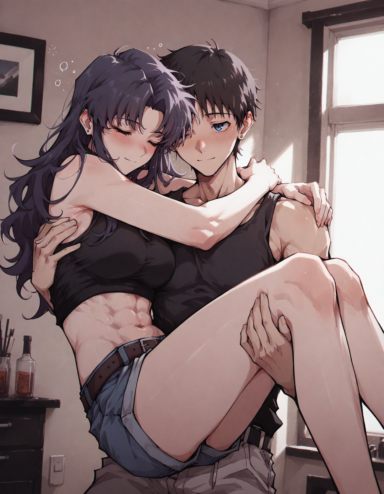 Подойдя к Мисато, привычно подхватил её под ноги и, придерживая за спину, закинул на себя.