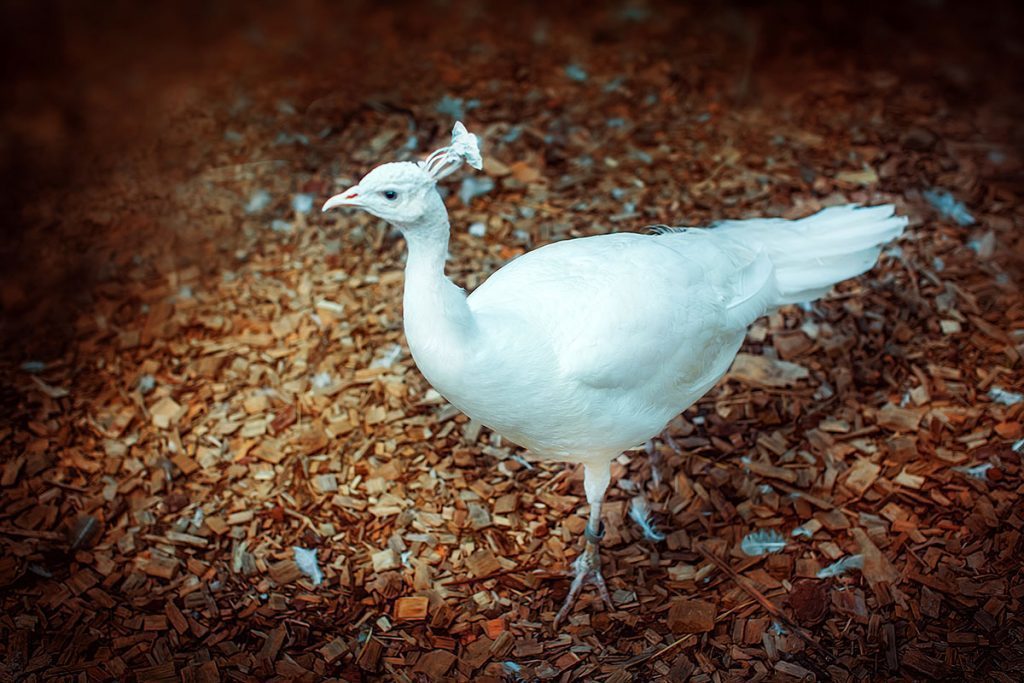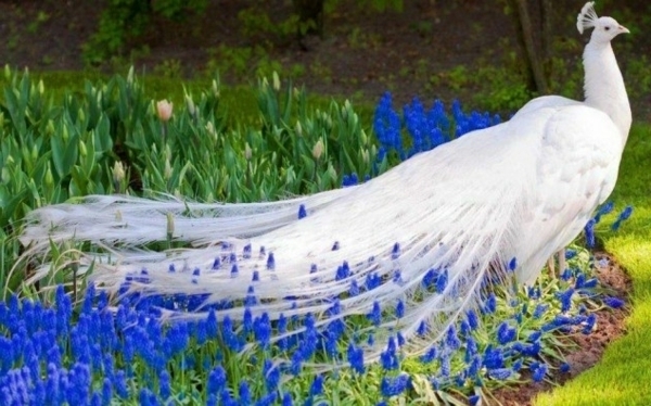 Перед небольшим прудом гордо вышагивали удивительной красоты птицы белого цвета с роскошными хвостами из длинных перьев с «глазком» на конце каждого из них. На голове у них были красивые хохолки, напоминавшие корону, а глаза были пронзительно синими. Таких царских экземпляра было три. Это явно были самцы. Они высокомерно несли себя в сторону симпатичного домика, видимо птичника.