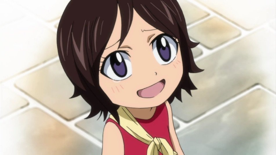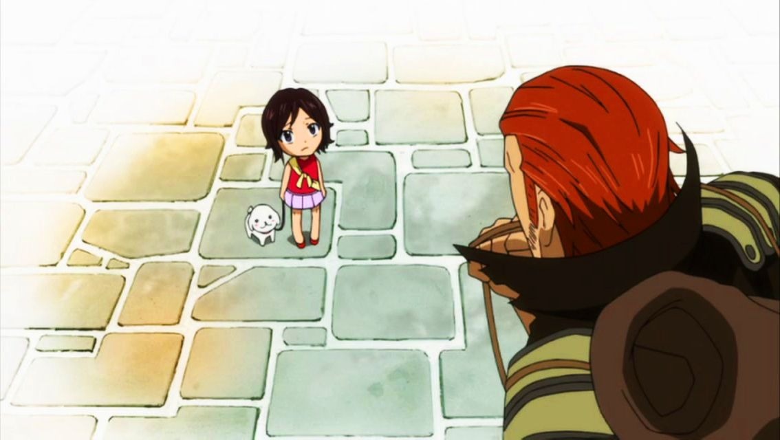 Заприметив возле луковичной двери Хвоста маленькую девчушку в красной блузке и фиолетовой юбочке, Шугарлан озадачился странной гостьей ненормальной гильдии. И ведь подумать только, у мелкой, в руке была не менее крохотная собачонка на поводке в качестве «напарника». Мелкая фанатка очень осторожно заглядывала в дверной проём и определённо нервничала!